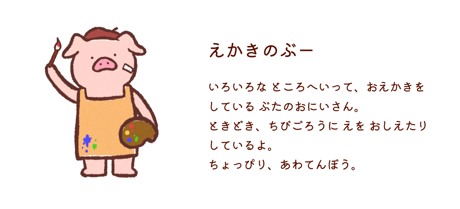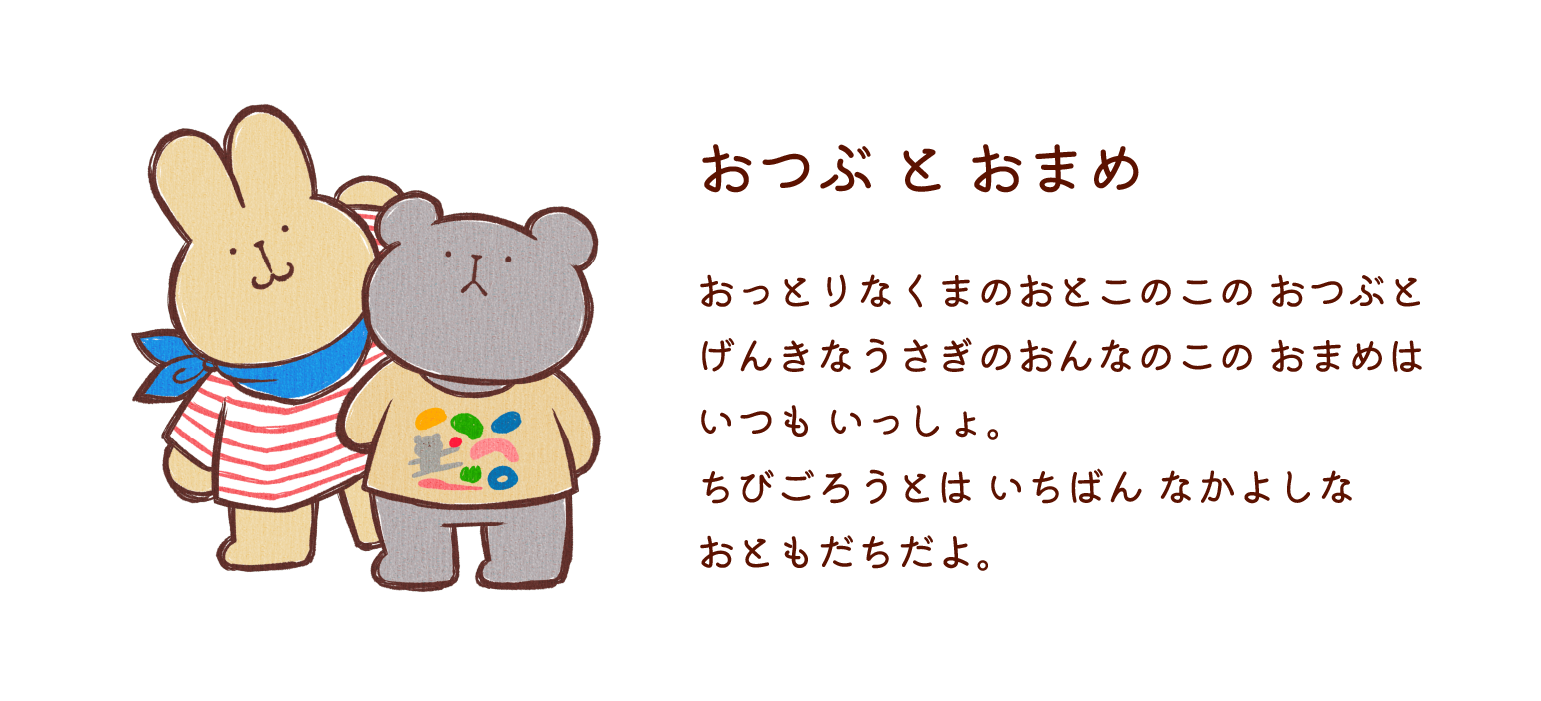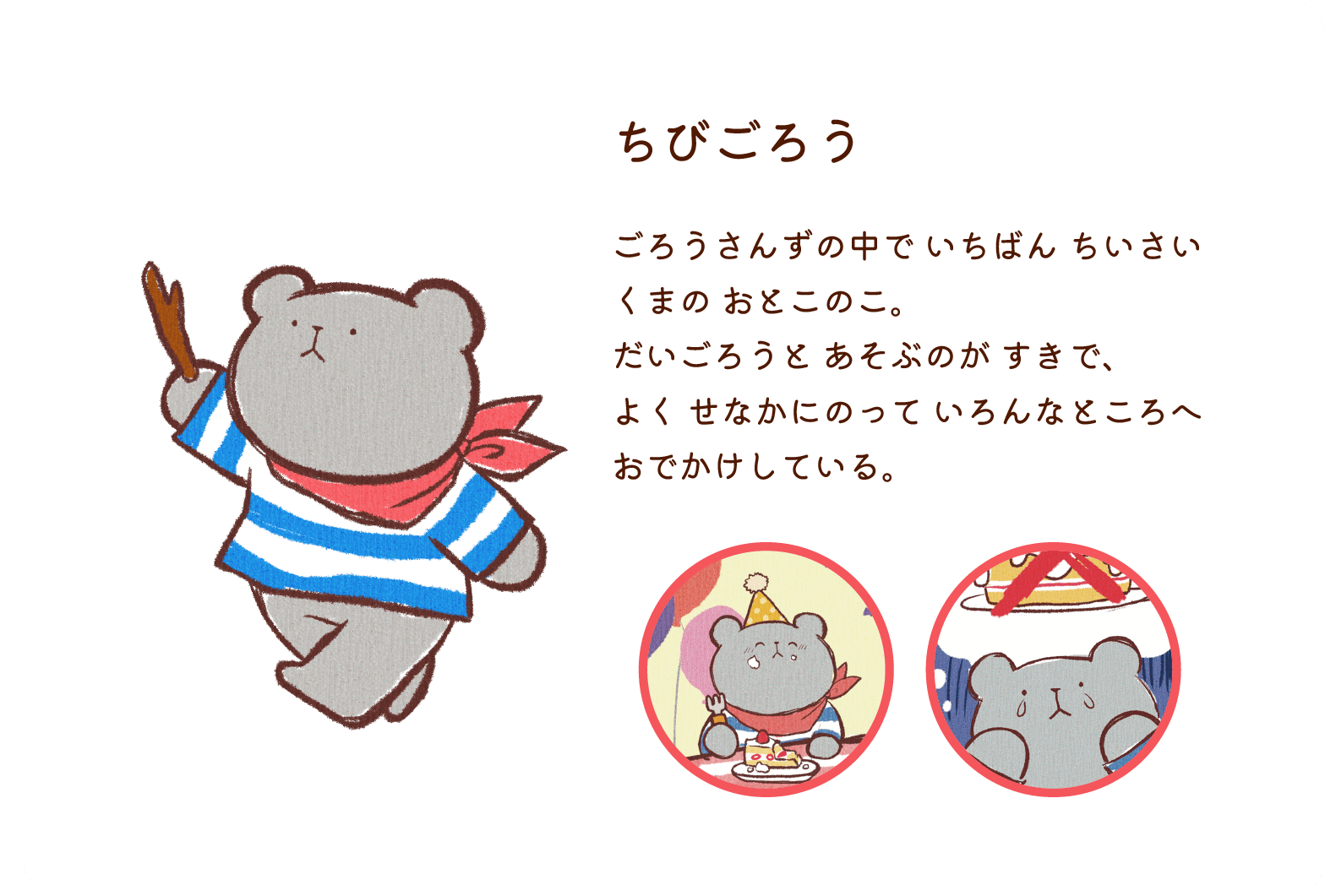 主人公のごろうさんずとおつぶ&おまめのデザインは