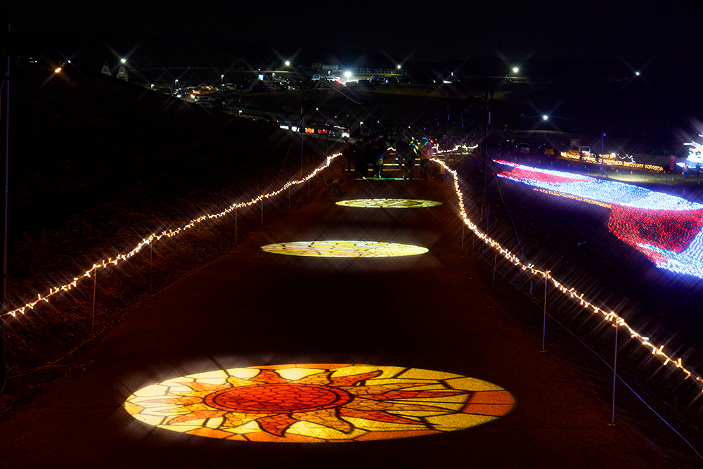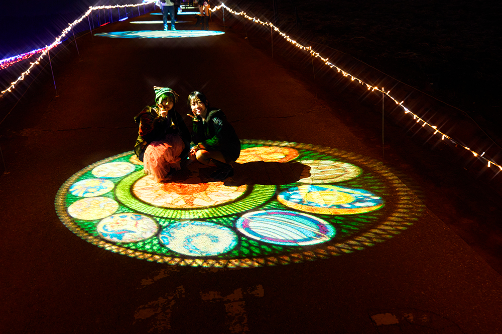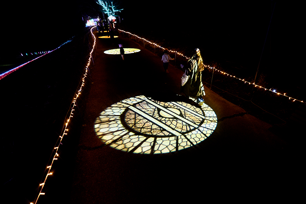 ゴボライト(回転投影照明)を使用し、遊歩道を幻想的な光のギャラリーへと演出。学生が円形フォーマットで光のデザインを考案。