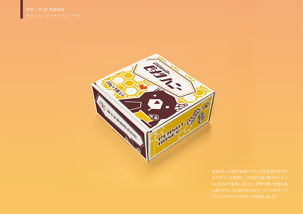 道の駅などで販売されるBOX型「ピーナツハニー」のパッケージをテーマにデザイン制作を行い、コンペ形式で作品を提出しました。