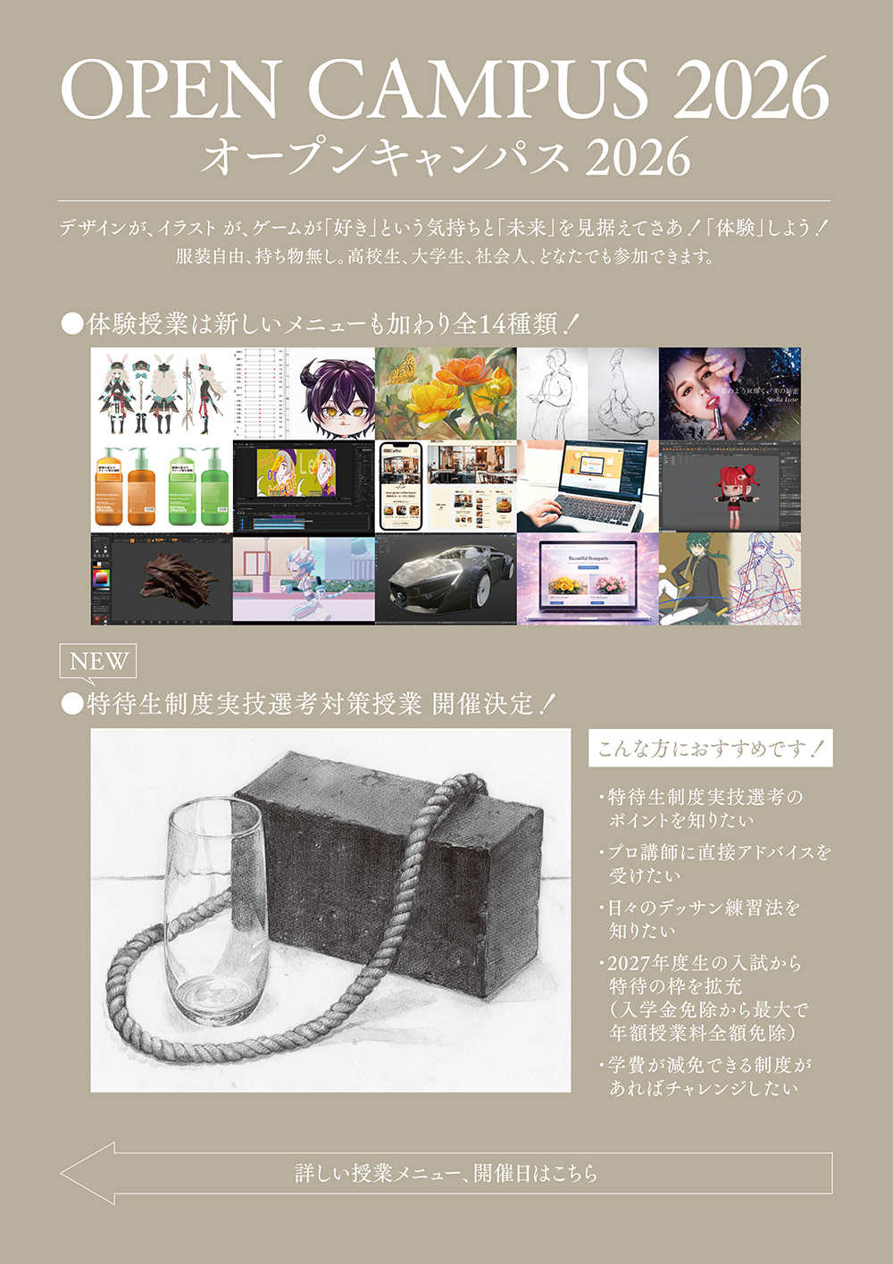 特待生制度実技選考に安心してチャレンジしていただけるよう、オープンキャンパスの体験授業にデッサン対策授業を新たに設置しました。