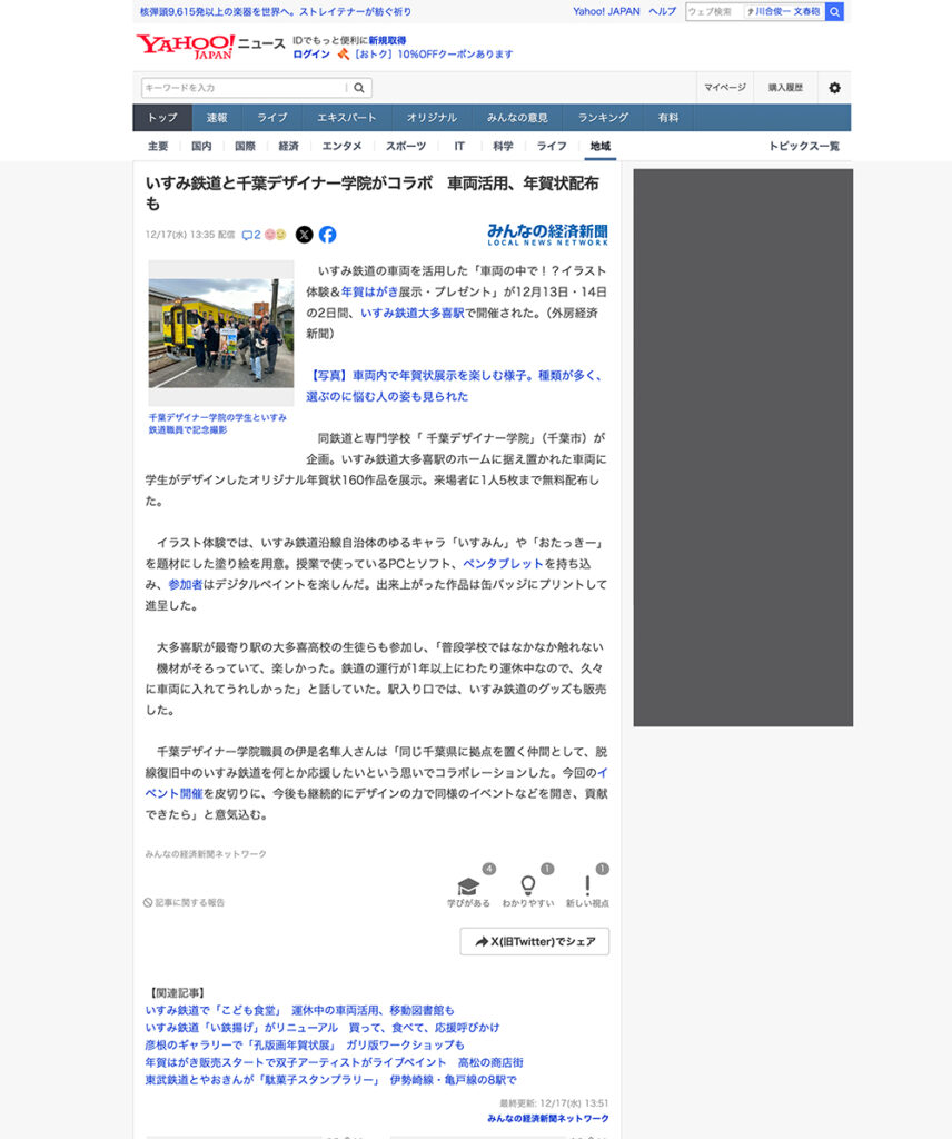 本校は「いすみ鉄道株式会社」と連携し、列車内でイラスト制作を体験できる特別イベントを開催します。